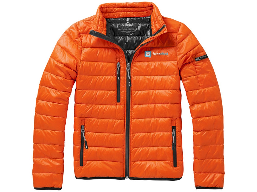 Легкая куртка- пуховик Scotia. Ткань не пропускает пух. Карманы для рук и нагрудный на молнии. Карман на рукаве на молнии можно использовать для нанесения. Резинка на манжетах и внизу куртки. Ремешки на собачку (второй комплект в цвете антрацит).Внутренний противоветровой клапан и защита подбородка. Ткань дышащая, ветронепроницаемая и влагоотталкивающая. Легкий пуховик. Ткань из 100% нейлона с матовым и блестящим водоотталкивающим покрытием, 20D. 90% пух и 10% перо. 115 г/м².