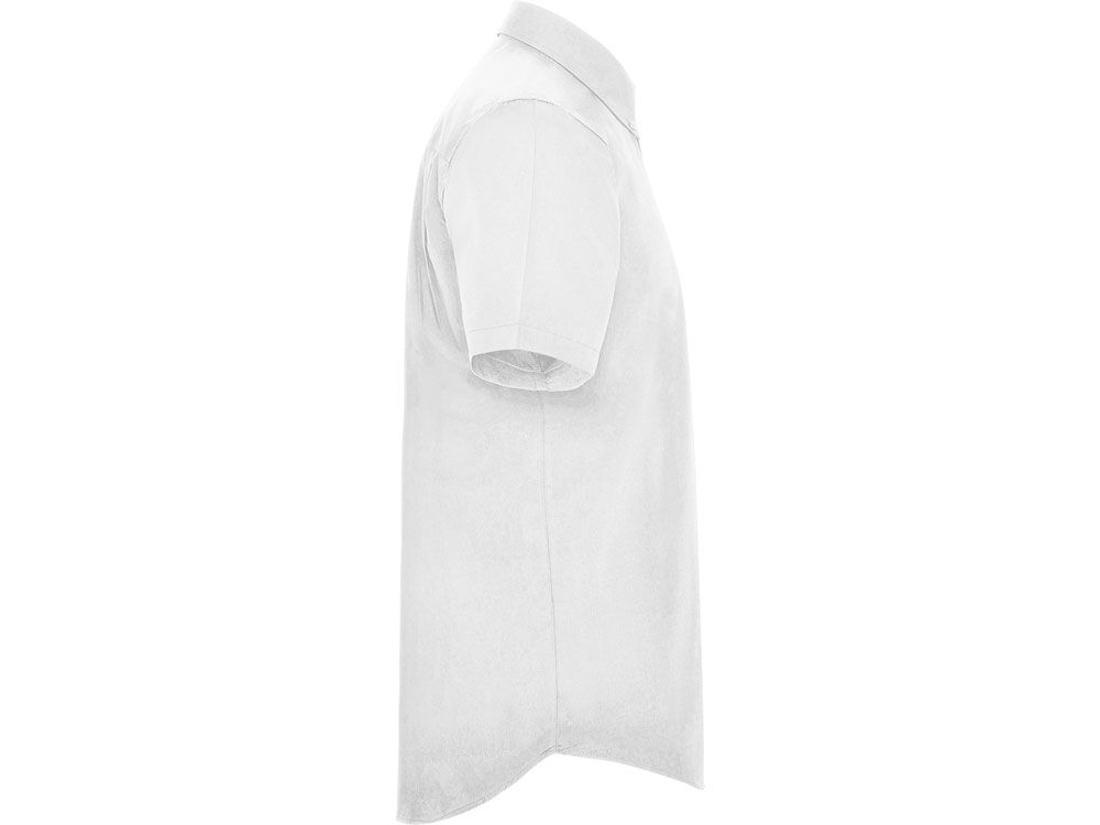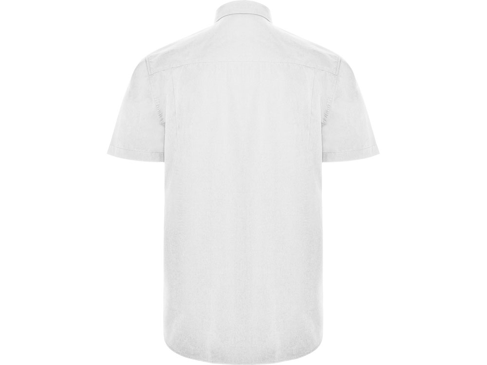 Рубашка мужская с коротким рукавом на семи пуговицах. Накладной карман на груди слева, закругленный низ изделия. Уголки воротника продублированы пуговицами.