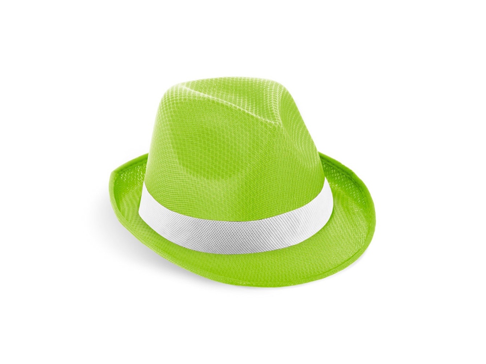 Шляпа из РР (доступна в нескольких цветах) с белой лентой из полиэстера. Для заказов без нанесения лента поставляется отдельно от шляпы. Размер: 580 мм