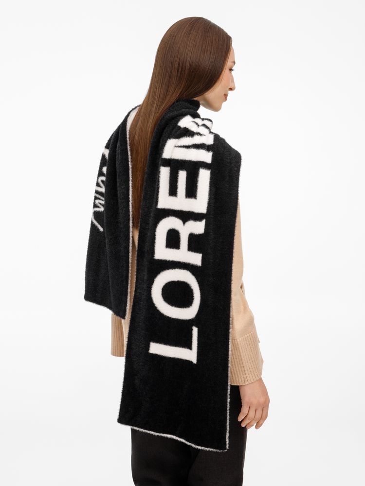 Шарф из пушистого нейлона с вывязанным логотипом и индивидуальным рисунком в черно-белой гамме.