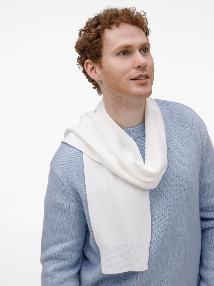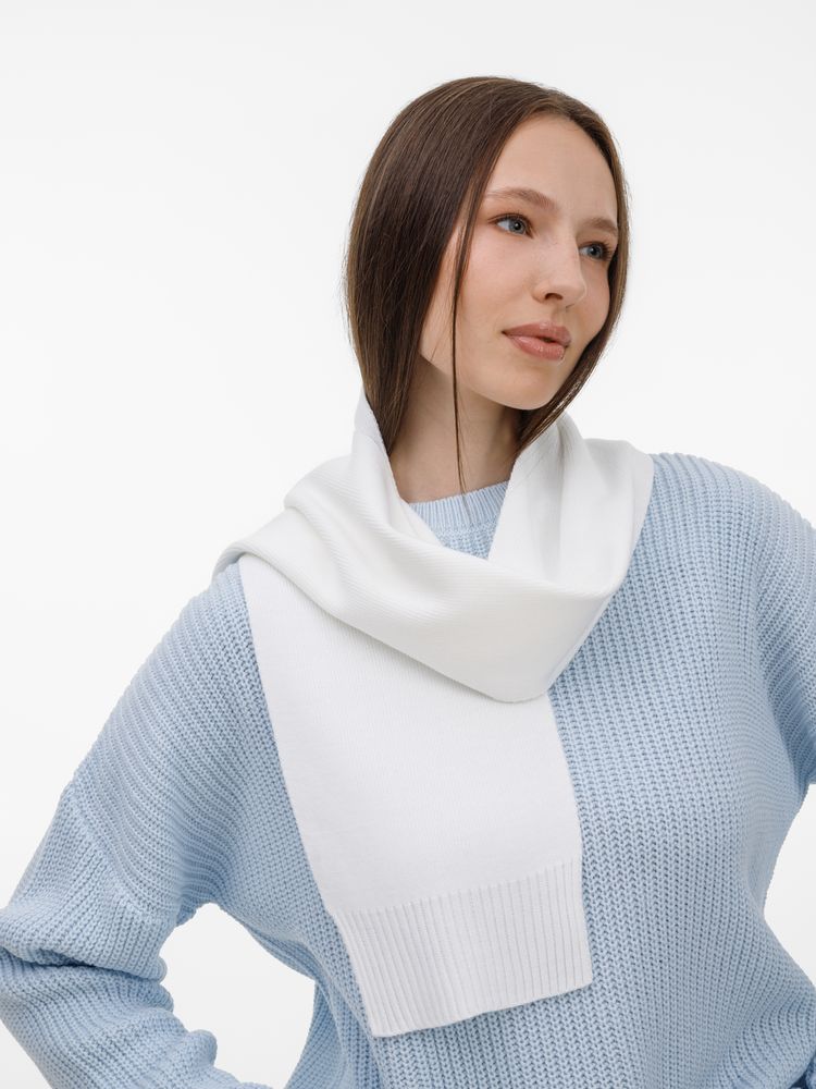 Классический однослойный шарф гладкой вязки. Края, связанные резинкой, придают изделию завершенный и аккуратный вид.