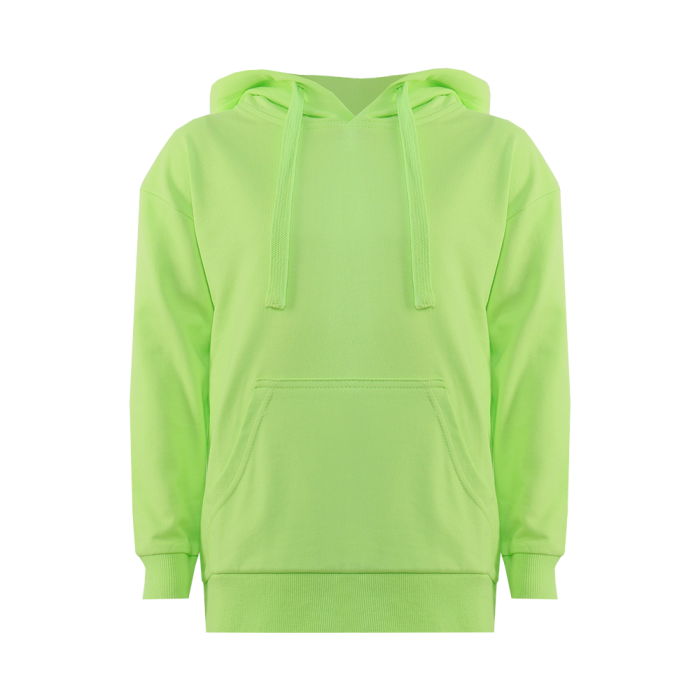 Модель прямого силуэта с капюшоном комфортной глубины, спущенной линией плеча и накладным карманом-кенгуру. Капюшон регулируется плоским шнуром, горловина спинки усилена киперной лентой. Манжет и низ изделия выполнены широкой эластичной резинкой в тон основному цвету.