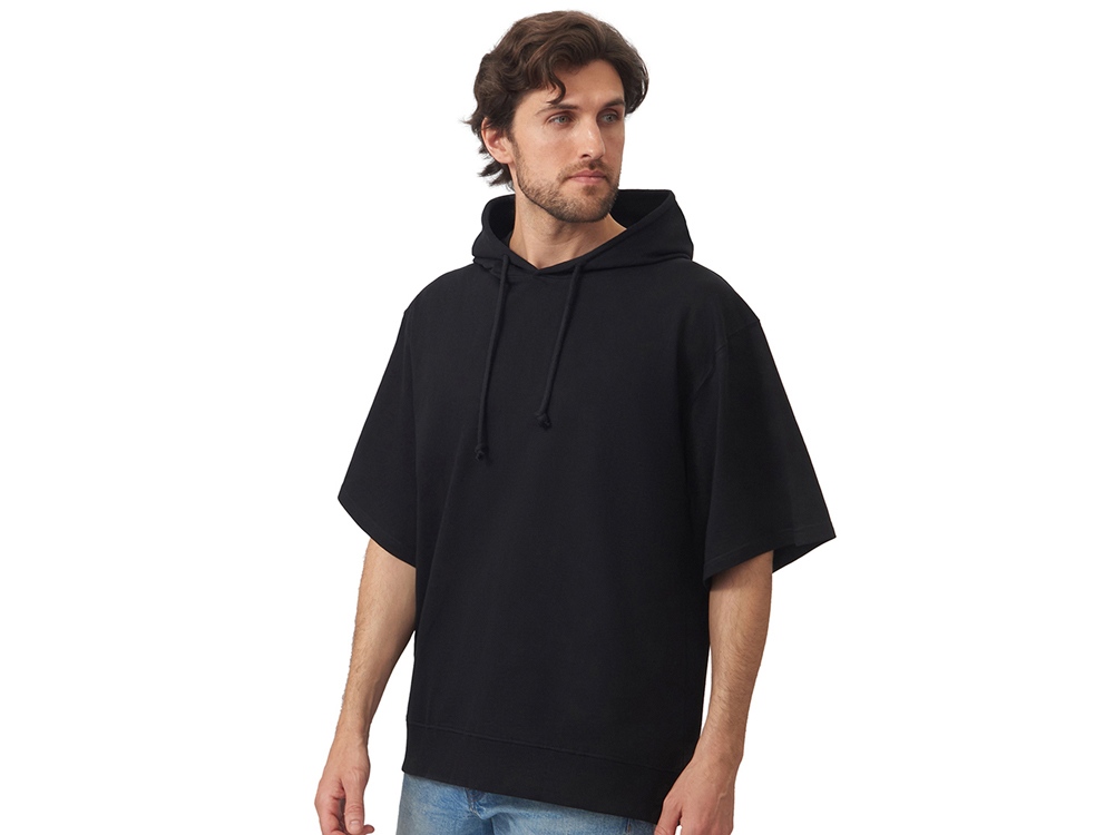 Худи с коротким рукавом выполнено из хлопкового френч терри с петельками на изнаночной стороне. Подкладка капюшона выполнена из основного полотна для объемной посадки. Модель комфортной и актуальной посадки оверсайз отлично подходит для обычной жизни и в качестве промо мерча.
