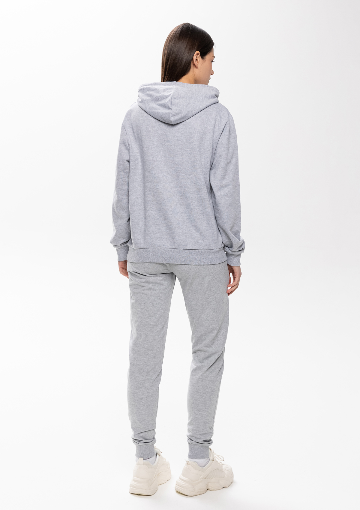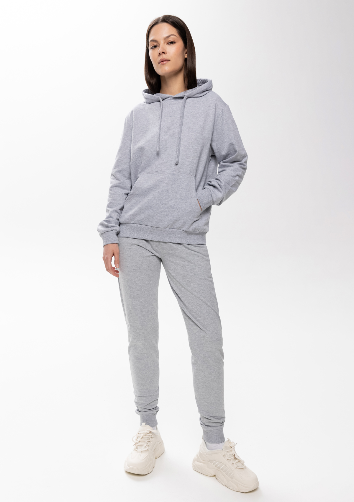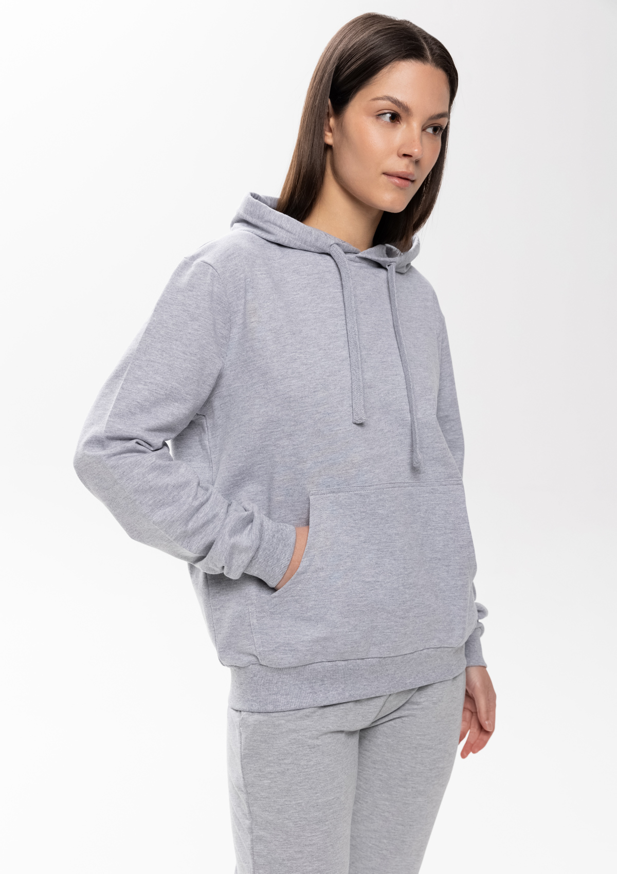 Толстовка прямого силуэта с капюшоном, втачным рукавом и карманом-кенгуру. Капюшон дополнен шнурком для регулирования прилегания, манжет и низ изделия оформлены широкой эластичной резинкой. Возможно два варианта исполнения: контрастные шнурок и бейка/шнурок и бейка в цвет толстовки.