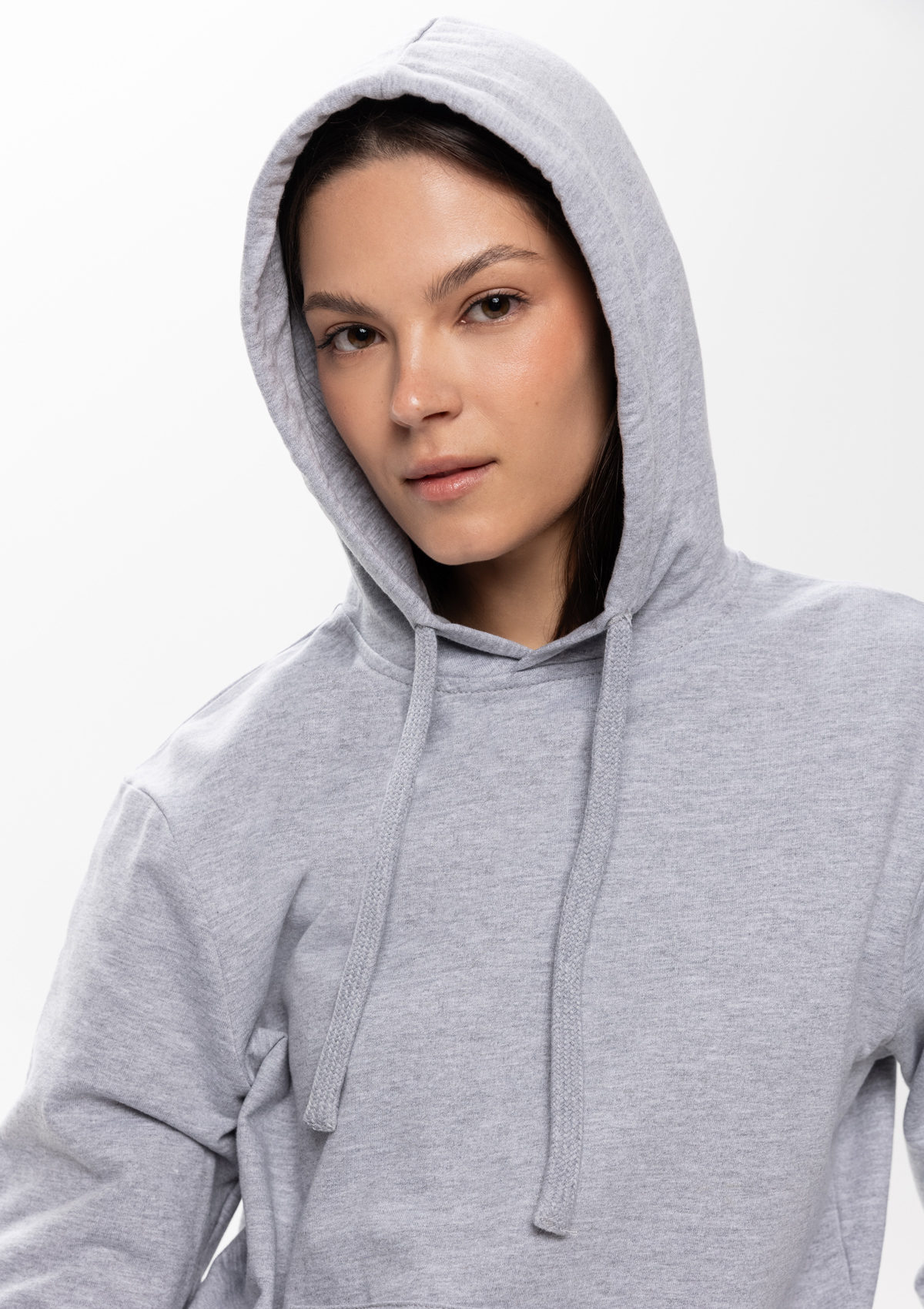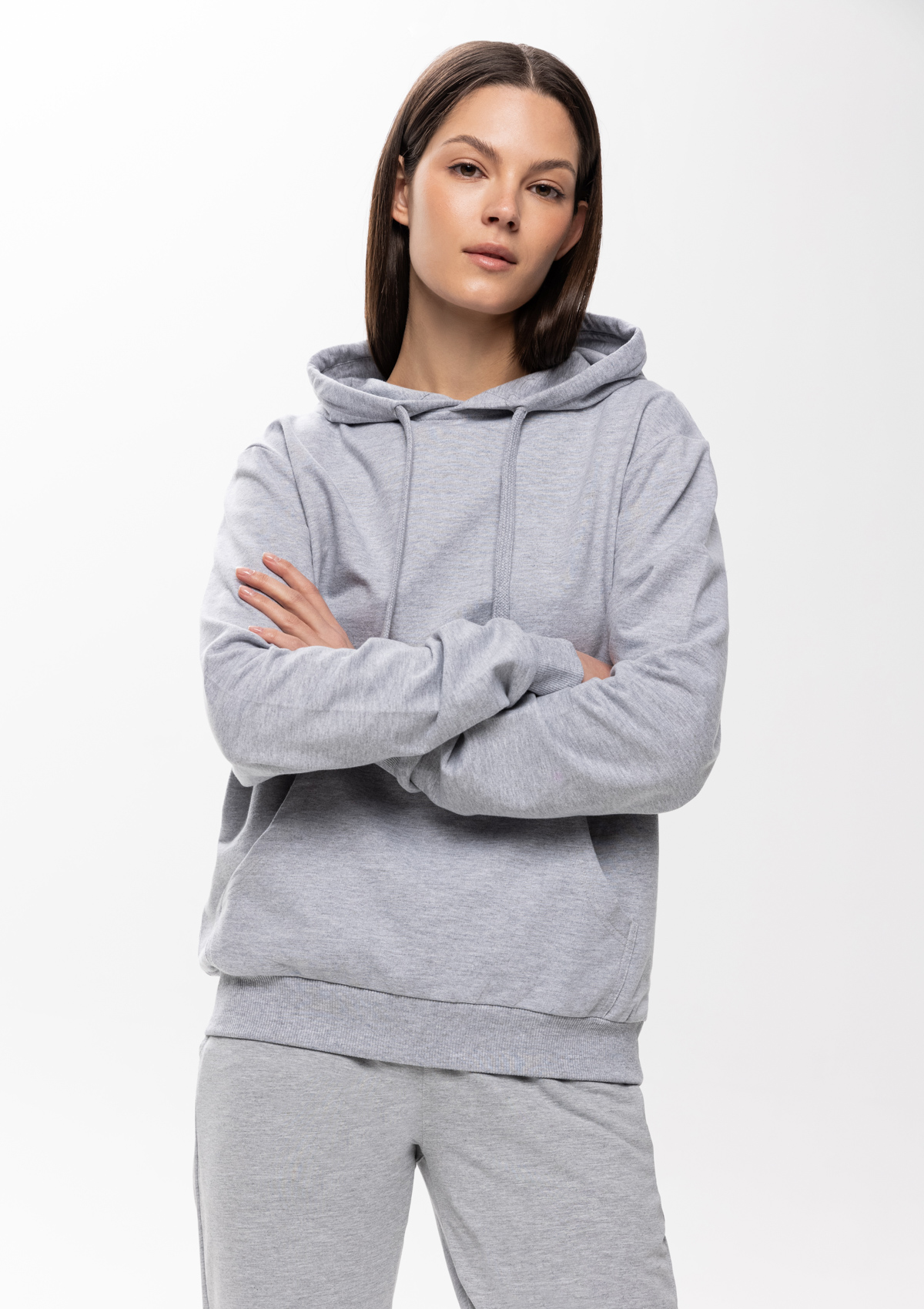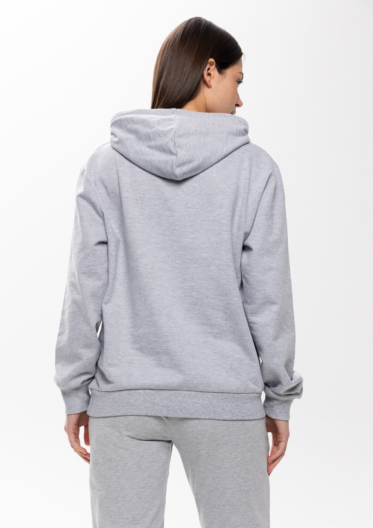 Толстовка прямого силуэта с капюшоном, втачным рукавом и карманом-кенгуру. Капюшон дополнен шнурком для регулирования прилегания, манжет и низ изделия оформлены широкой эластичной резинкой. Возможно два варианта исполнения: контрастные шнурок и бейка/шнурок и бейка в цвет толстовки.