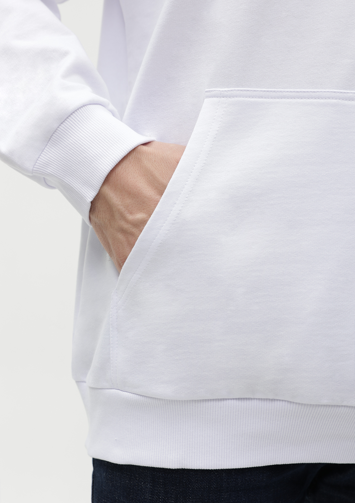 Толстовка без начеса выполнена из мягкого футера (100% хлопок), подклад – кулирная гладь (100% хлопок). Оба материала устойчивы к механическому воздействию и вытяжению, практически не поддаются пилингу.