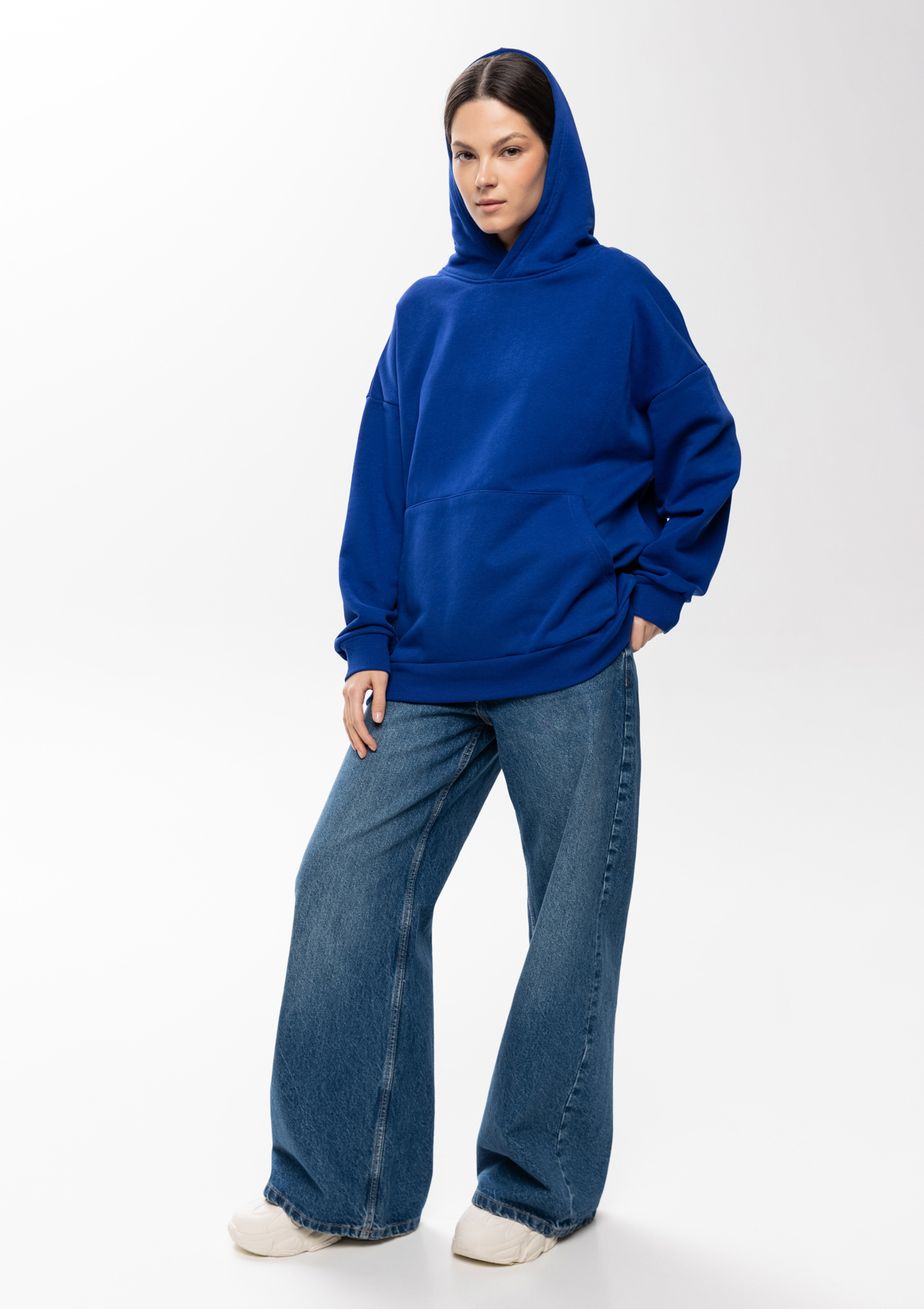 Универсальная толстовка свободного силуэта с капюшоном комфортной глубины, спущенной линией плеча и глубоким карманом-кенгуру. Манжет и низ изделия оформлены широкой эластичной резинкой.