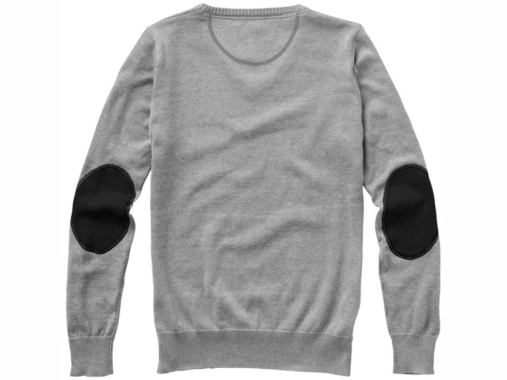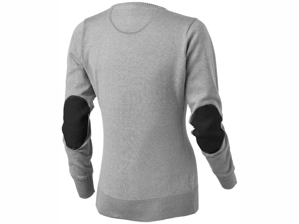 Женский пуловер Spruce с V-образным вырезом. Стандартный покрой. Резинка 1х1 на воротнике, манжетах и на поясе. Саржевые заплаты на локтях в антрацитовом цвете. Принт лого сзади в тон изделия. Внутри антрацитовый полумесяц из твила. Атласная лента внутри горловины. Гладкий трикотаж, 60% хлопок и 40% полиэстер. Толщина: 12.