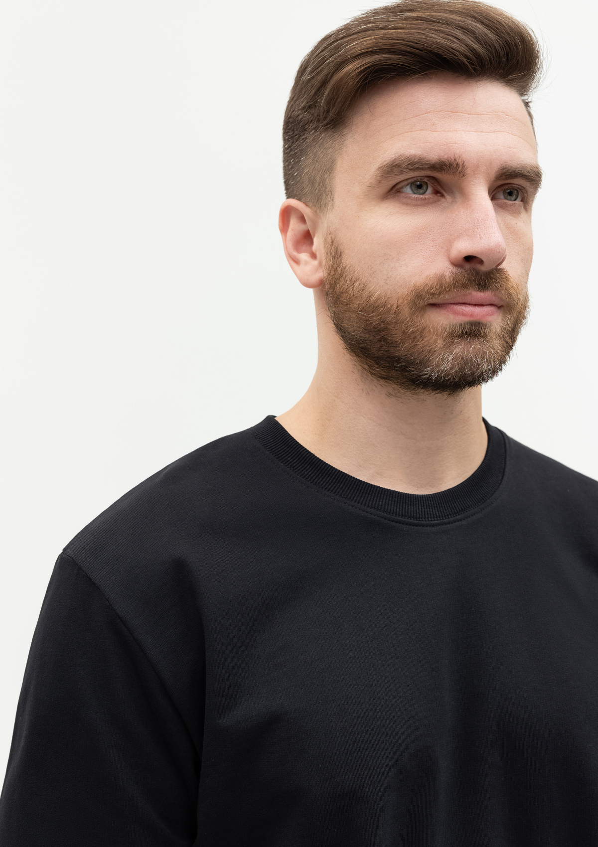 Модель выполнена из плотного хлопкового футера, который хорошо удерживает тепло, обеспечивая комфорт в прохладную погоду. Материал устойчив к механическому воздействию и вытяжению, практически не поддается пилингу.