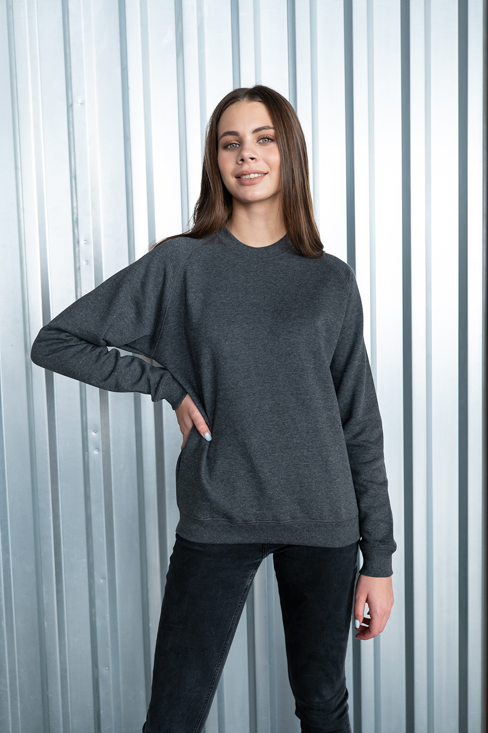 Модель прямого силуэта с округлым воротом и рукавом-реглан. Ворот, манжет и низ изделия оформлены широкой эластичной резинкой.