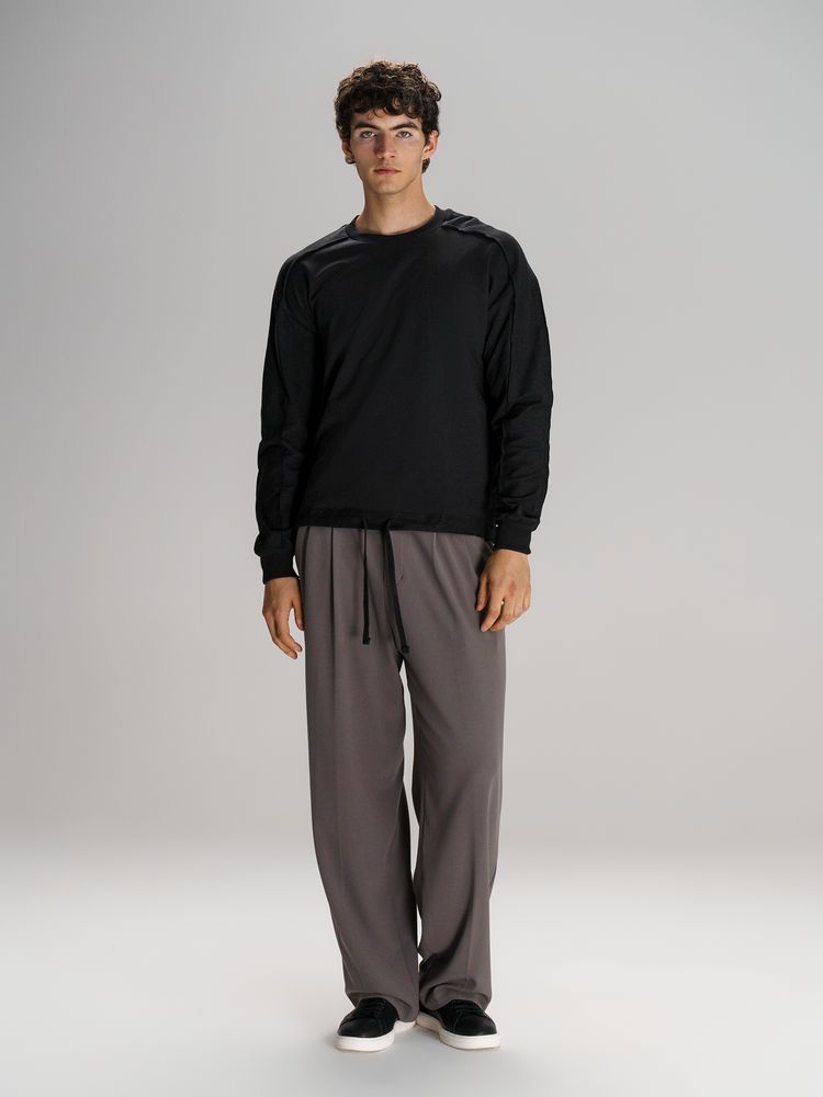 Свитшот унисекс оригинального пошива вдохнет новую жизнь в повседневный гардероб и добавит стильную нотку легкой небрежности в образ. Особая конструкция, где часть деталей — плечи и рукава — вывернута наизнанку, создает необычный притягательный эффект.