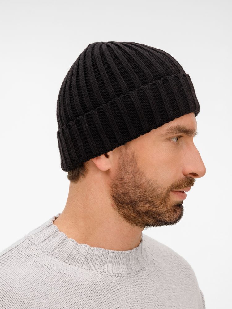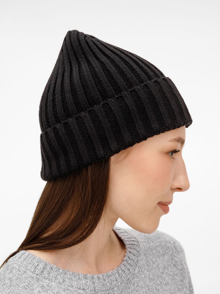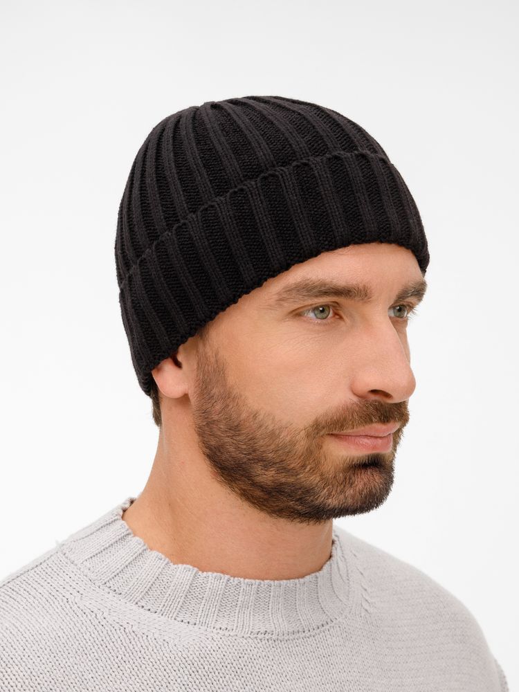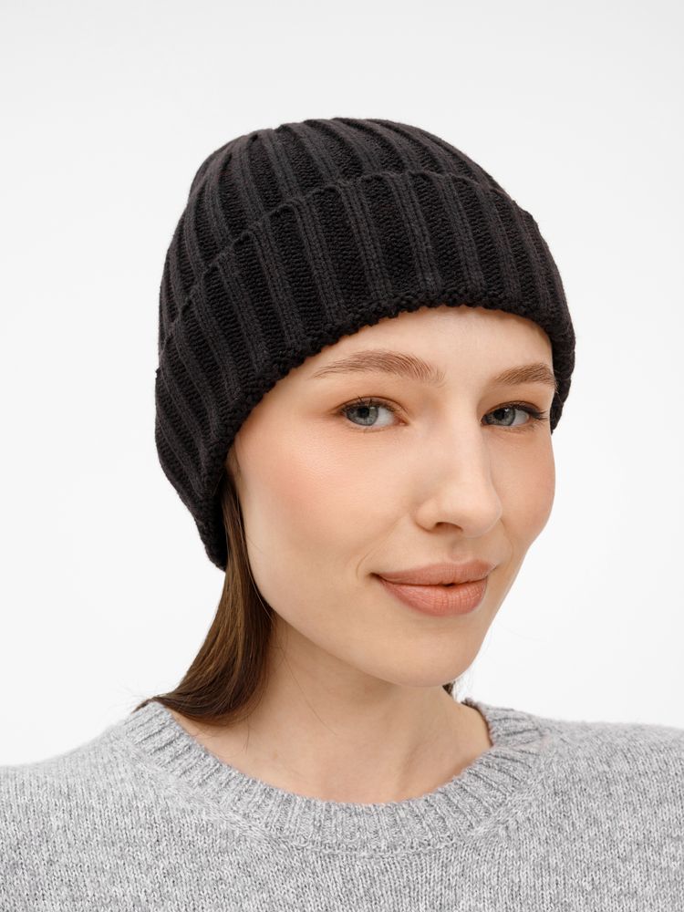 Однослойная шапка рельефной вязки с отворотом.