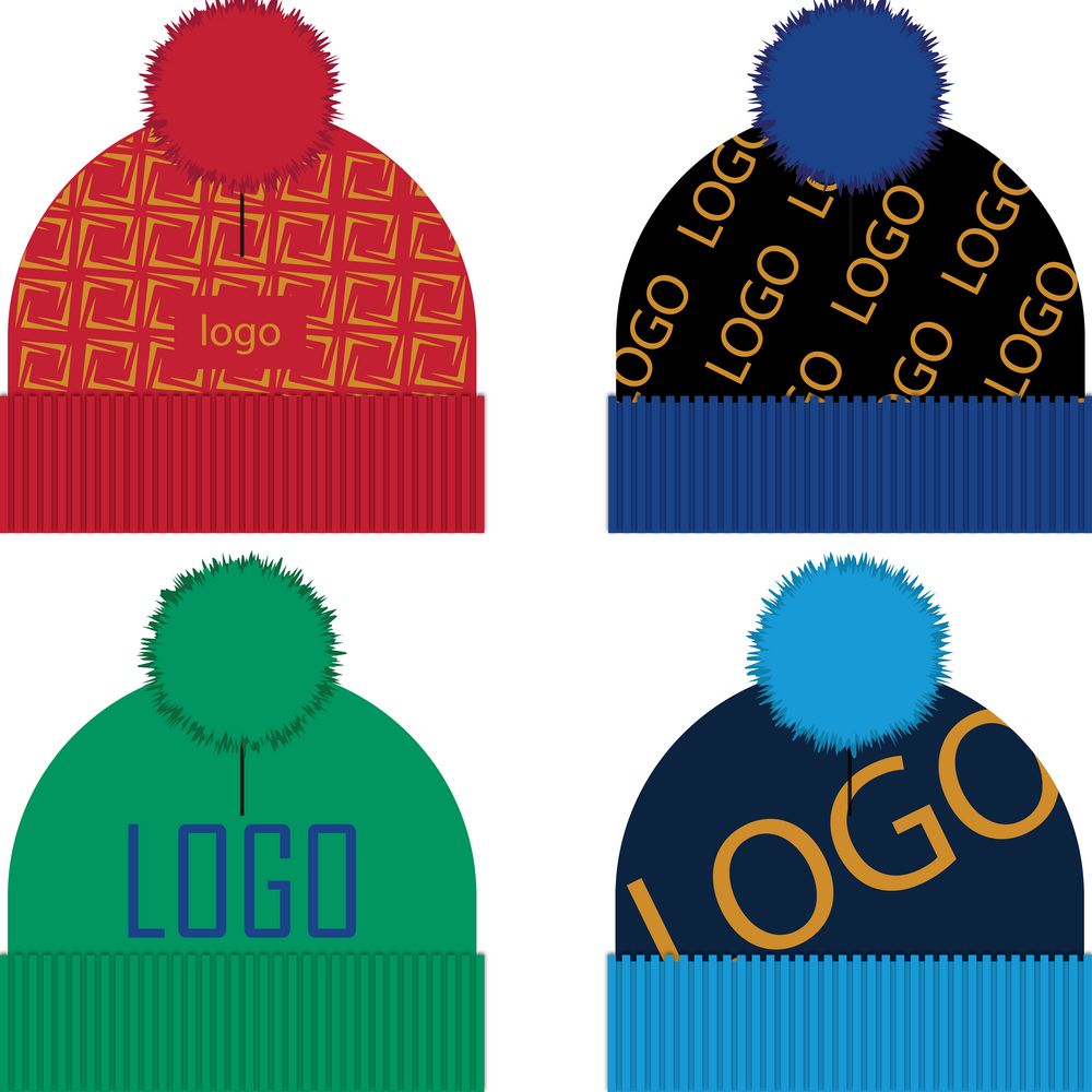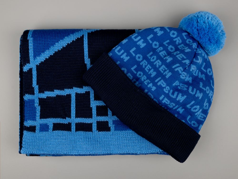 Шапка с вывязанным логотипом и индивидуальным рисунком в фирменной цветовой гамме.