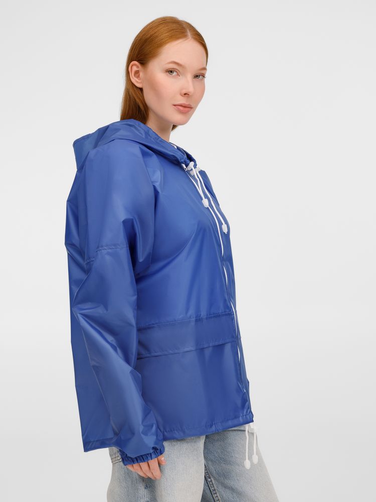 Укороченный дождевик свободного кроя из ткани таффета с влагозащитным покрытием. Складывается в мешочек — удобно брать с собой.