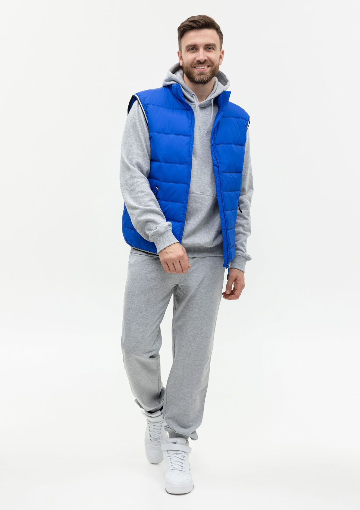 Мужской жилет прямого силуэта с геометричной стежкой, воротником-стойкой, прорезным карманом и застежкой на молнию. Изделие дополнено контрастной резинкой по пройме и линии низа для дополнительной защиты от холода и ветра.