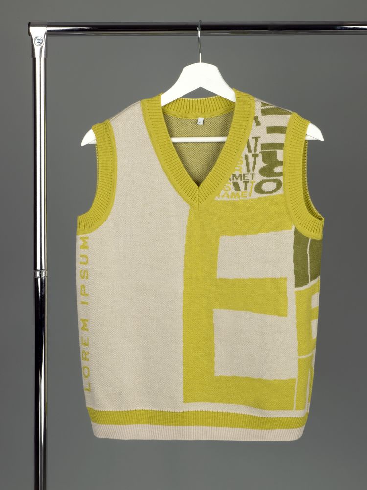 Модель: жилет жаккардовой вязки, плотный и теплый, 2–3 цвета нитей, гладкая поверхность. На бейках горловины и проймы возможна отделка в виде контрастных полос (не более 3-х цветов).