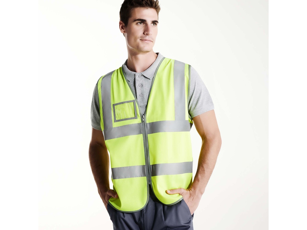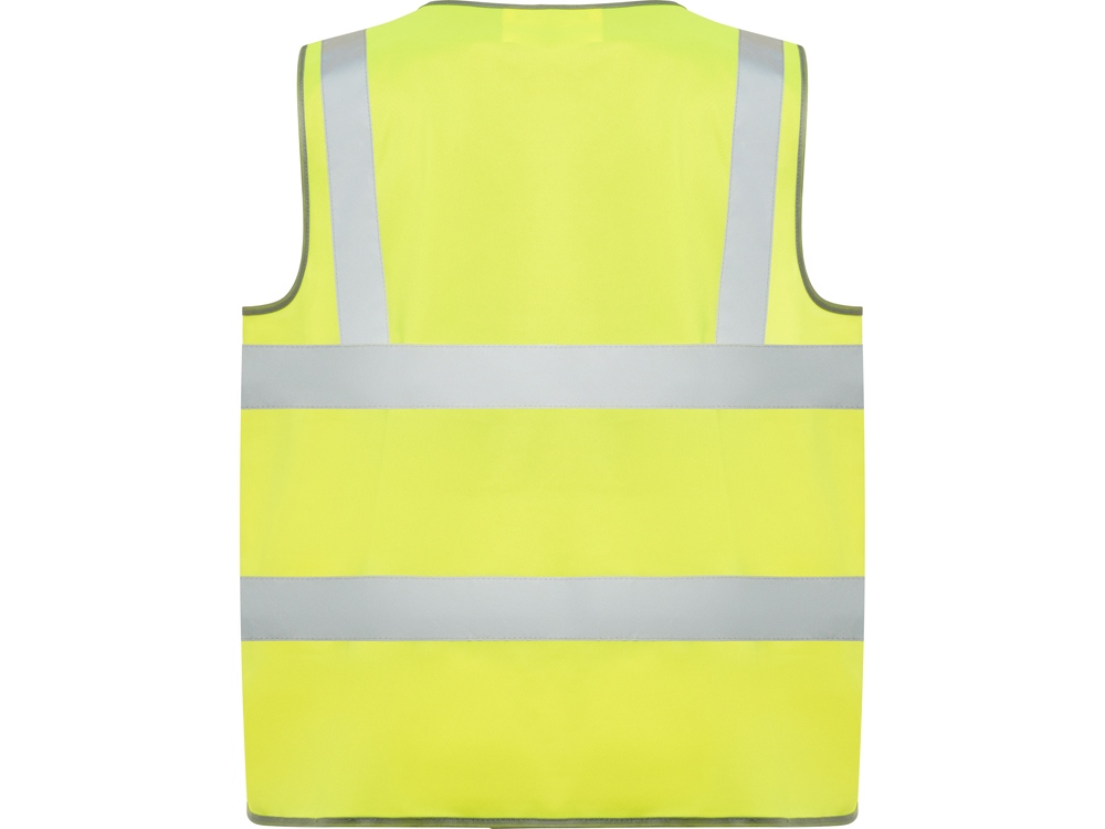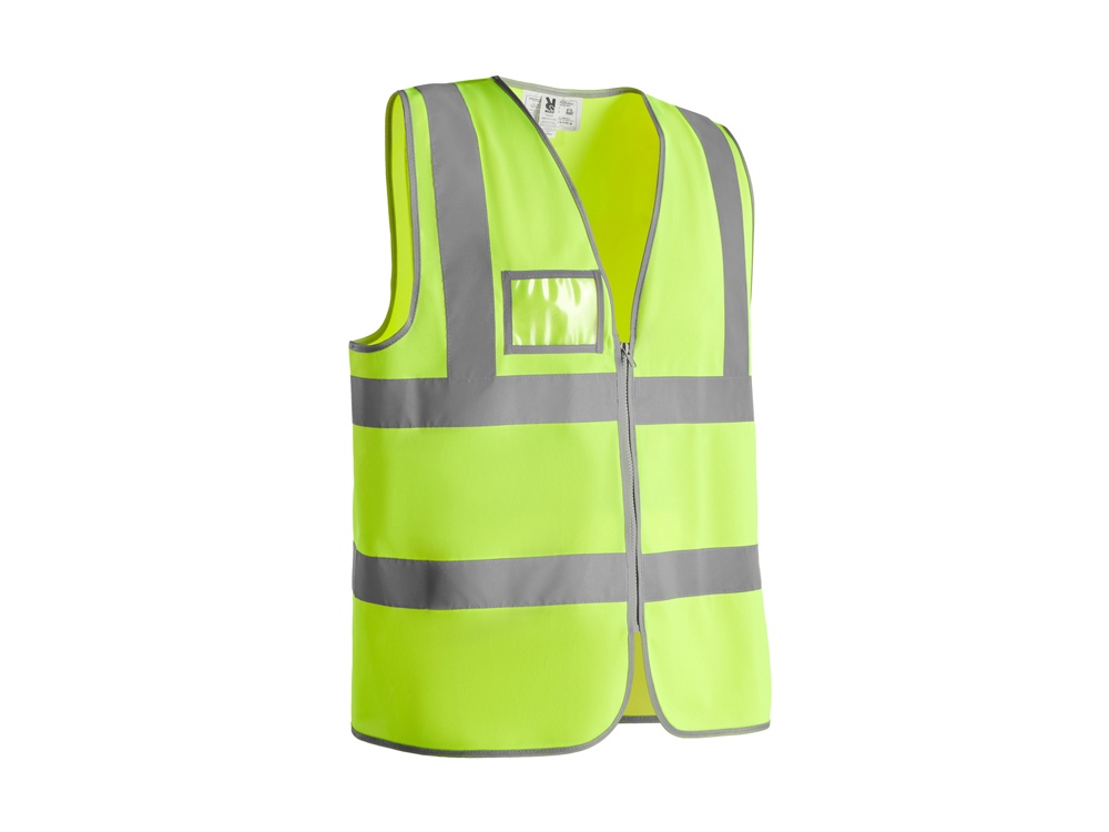 Жилет светоотражающий на молнии. Две горизонтальные светоотражающие полосы на полочке и одна по плечам. Прозрачный карман на груди справа.