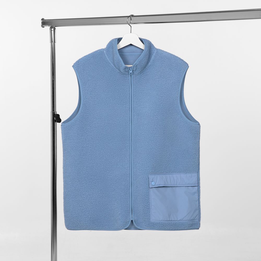 Жилет на молнии из современного двухслойного материала — модный искусственный мех снаружи и уютный флис внутри. Накладной карман из гладкого нейлона создает заметный визуальный контраст и делает жилет Oblako по-настоящему стильным предметом гардероба.