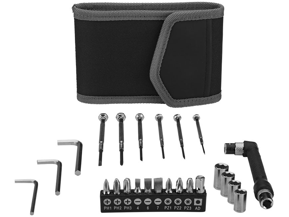 Набор инструментов в чехле с эластичными петельками. В наборе: набор мини отверток 6 шт., одна прорезиненная ручка, девять насадок в холдере: Philips размеры (PH1, PH2, PH3), три плоские (#4, #6, #7), три фигурные (PZ1, PZ2, PZ3) и один адаптер, три ключа (size 3, 4, 5) и четыре разъема (7mm, 8mm, 9mm and 10mm). Упакован в коробку STAC. 600D Полиэстер.
