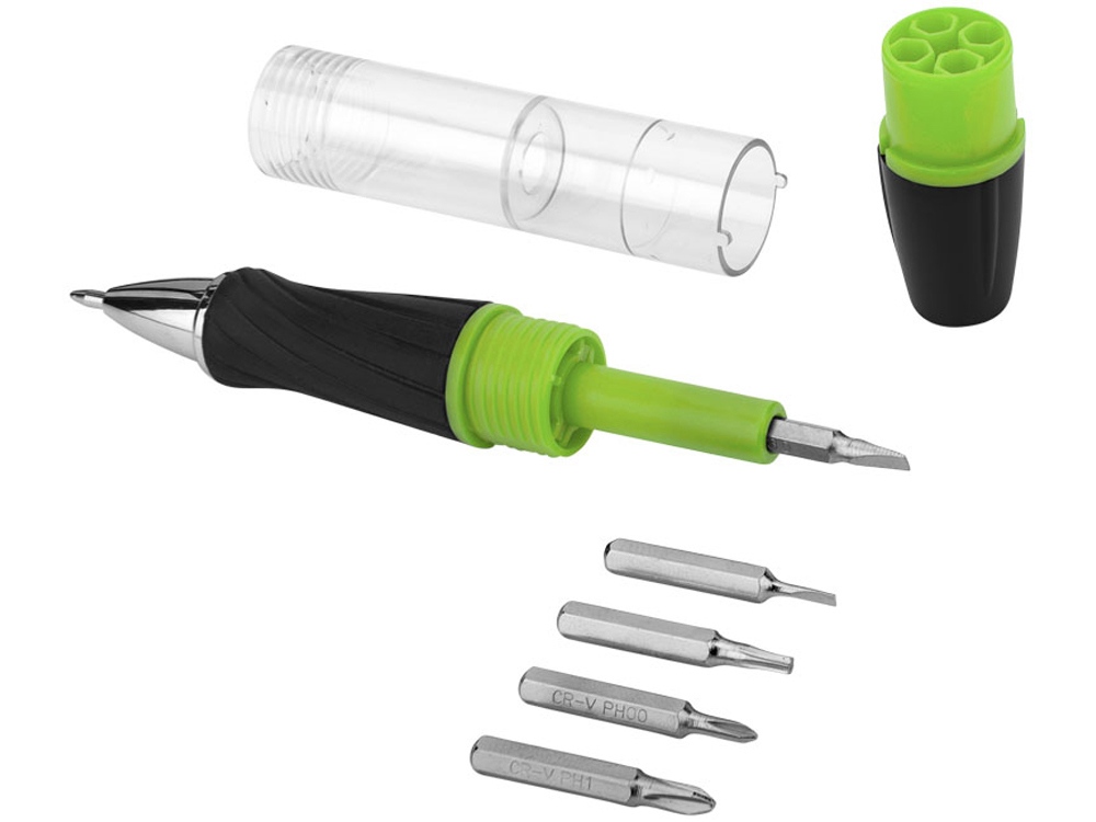 Инструмент King 7-ми функциональный с ручкой и фонариком. Шариковая ручка с поворотным механизмом, корпус- холдер для 5-ти насадок отверток. Светодиодный фонарик с поворотным включением. Батарейки в комплекте. АБС пластик.
