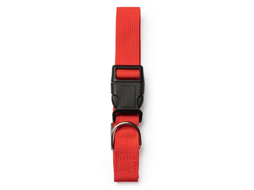 Ошейник для домашних животных из прочного и мягкого полиэстера. Регулируемый ремешок и пряжка с застежкой. Включает металлическое кольцо для прогулочного поводка.