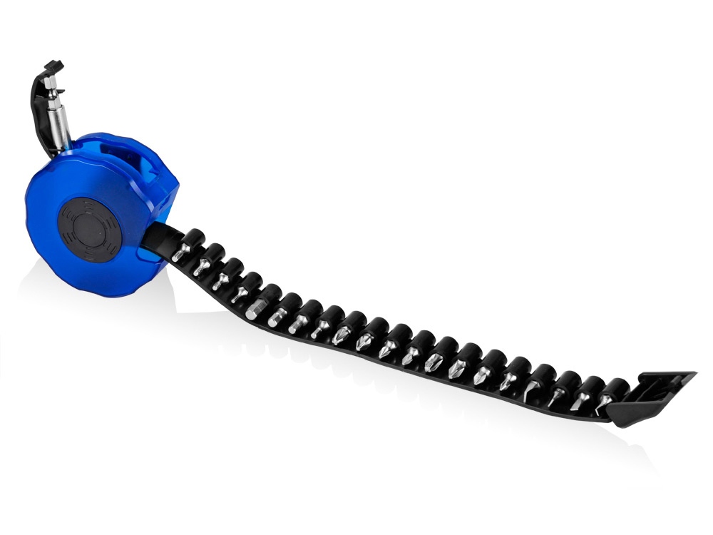 Набор из 20-ти бит, который вытягивается как рулетка, будет отличным промо-сувениром на строительной или промышленной выставке. Крепление позволяет удобно закрепить набор, а втягивающая кнопка быстро скрутить все биты обратно в набор.