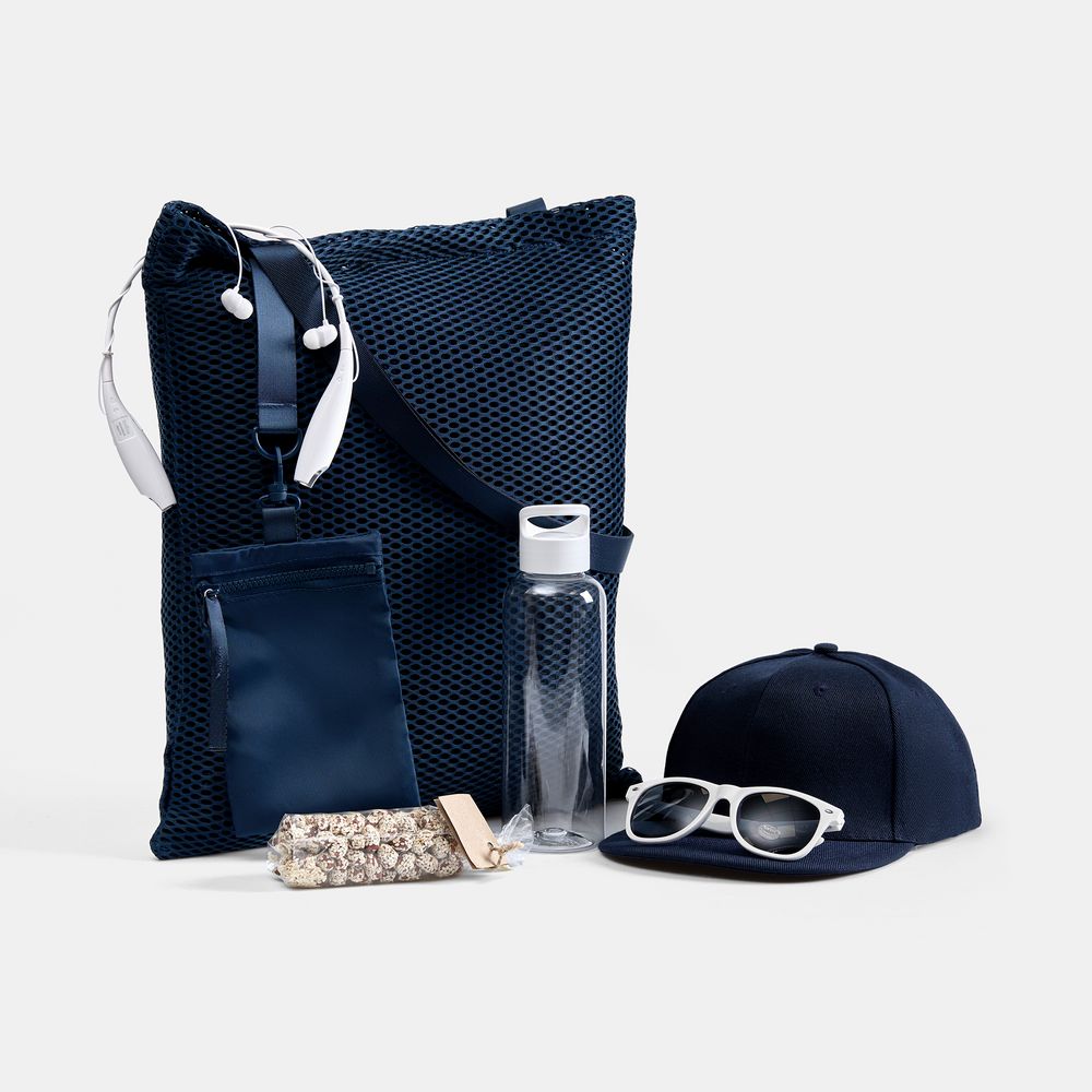 бейсболка - полиэстер 100%, плотность 300 г/м², бутылка - пластик, ПЭТ, наушники, очки - пластик, пластик, полиэстер, полиэстер 100%, трехслойная сетка, шопер - полиэстер, твил 290D с полиуретановой пропиткой