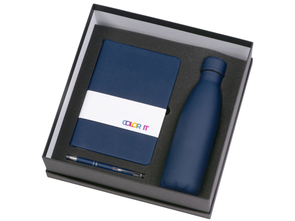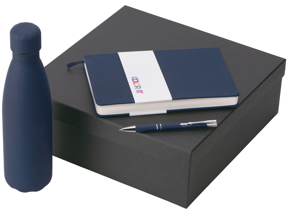 Подарочный набор с блокнотом С2, металлической ручкой и термобутылкой, темно-синий
