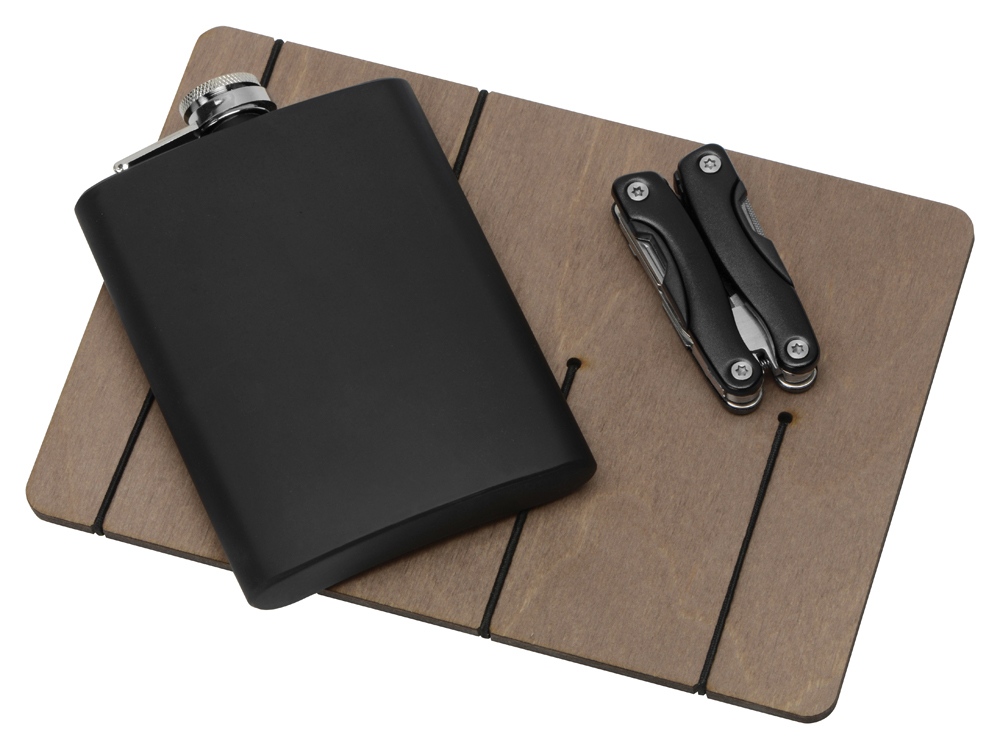 фляжка- нержавеющая cталь с покрытием soft-touch, мультиинструмент- металл, ложемент- фанера
