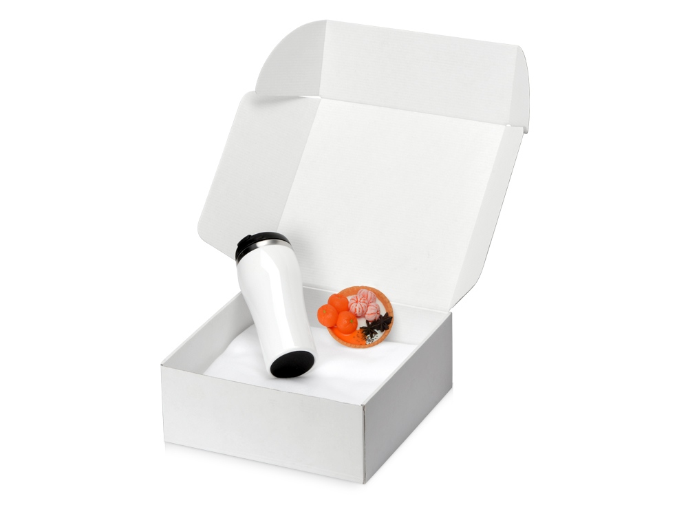 Плед, термокружка и мыло ручной работы упакованы в белую картонную коробку с наполнителем. Мыло ручной работы в виде тарталетки с мандаринами добавляет набору вкусную нотку, а термокружка и плед — станут согревающим уютным подарком. Трафаретная печать круговая (1 цвет (цветные изделия)) на данный товар осуществляется бесплатно. Оплачивается только настройка оборудования в размере 6400 рублей на весь тираж.