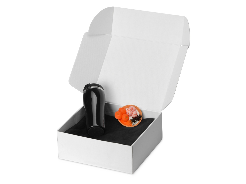 Плед, термокружка и мыло ручной работы упакованы в белую картонную коробку с наполнителем. Мыло ручной работы в виде тарталетки с мандаринами добавляет набору вкусную нотку, а термокружка и плед — станут согревающим уютным подарком. Трафаретная печать круговая (1 цвет (цветные изделия)) на данный товар осуществляется бесплатно. Оплачивается только настройка оборудования в размере 6400 рублей на весь тираж.