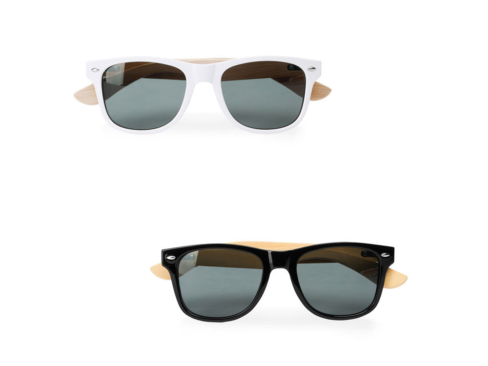 Солнцезащитные очки привлекательного дизайна с глянцевой оправой и дужками из натурального бамбука. Линзы с защитой UV400.