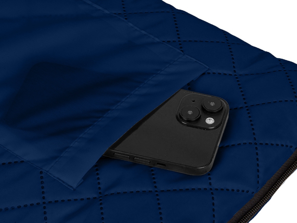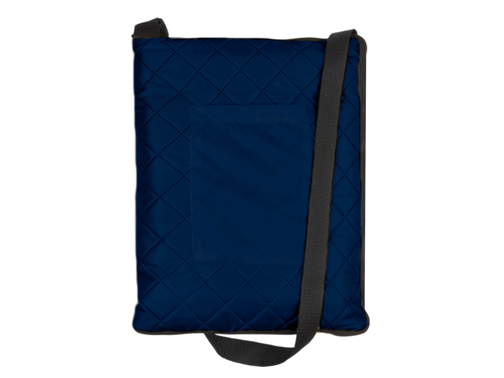 Двухсторонний плед с водоотталкивающим покрытием с одной стороны и мягким флисом с другой. Складывается в сумку на плечо и фиксируется с помощью молнии. В собранном виде имеет регулируемый по длине ремень для переноски и наружный карман для мелочей.