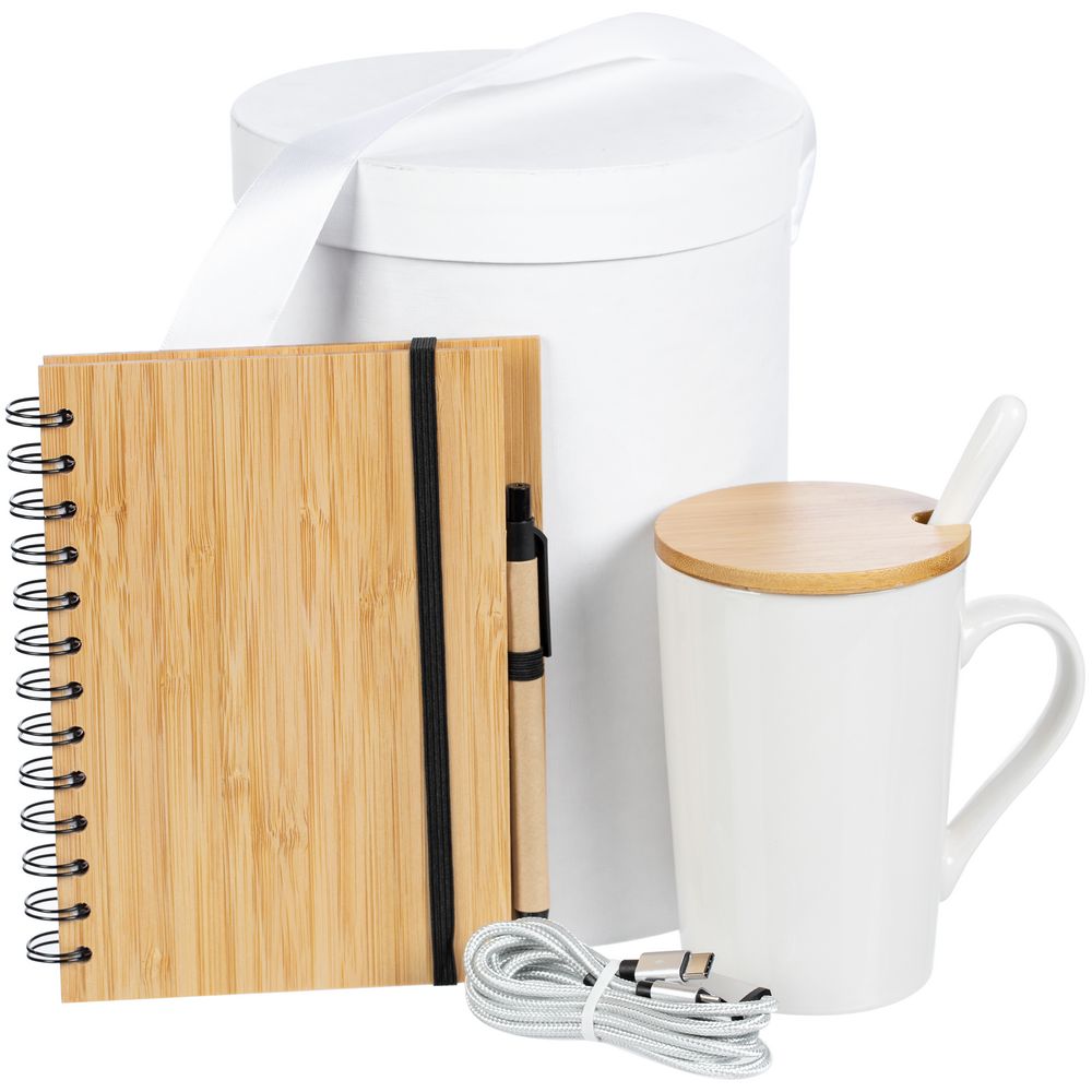 алюминий, бамбук, блокнот с ручкой - бамбук, картон, пластик, кабель - алюминий, нейлон, искусственная кожа, коробка - переплетный картон, кружка с ложкой - фарфор, нержавеющая сталь, бамбук, переплетный картон, фарфор