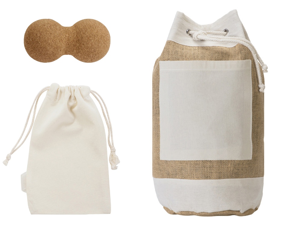 массажный мяч - пробковый материал, неокрашенный хлопок, рюкзак - 250 г, м2 натуральный джут, 140 г, м2 натуральный хлопок, карман -180 г, м2 натуральный хлопок