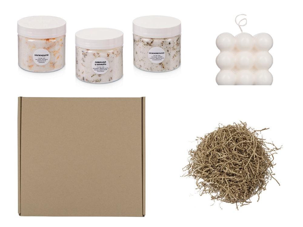 В набор входит три банки соли с ароматами календулы, можжевельника и лаванды с ванилью.