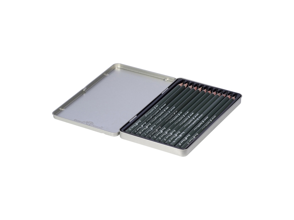12 карандашей разной твердости (2H, H, HB, B, 2B, 3B, 4B, 5B, 6B, 7B, 8B, 9B), металлическая коробка