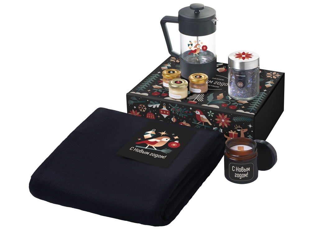 Подарочный набор c пледом, френчпрессом, чаем и медом, черный
