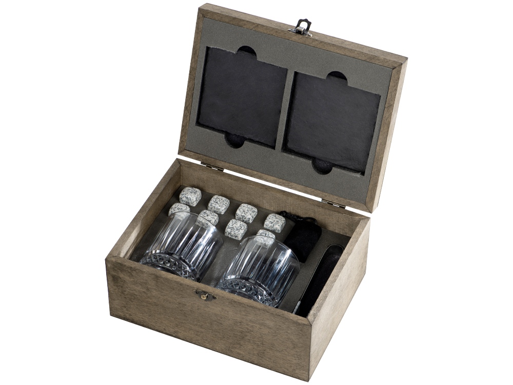 Набор для виски Jack состоит из двух стаканов с толстым дном, охлаждающих камней в мешочке, удобных щипцов и двух лаконичных костеров из сланцевого камня. Сет упакован в деревянную подарочную шкатулку, которая создает праздничное настроение еще до того, как вы откроете крышку. Более того, это уже готовый набор для подарка.