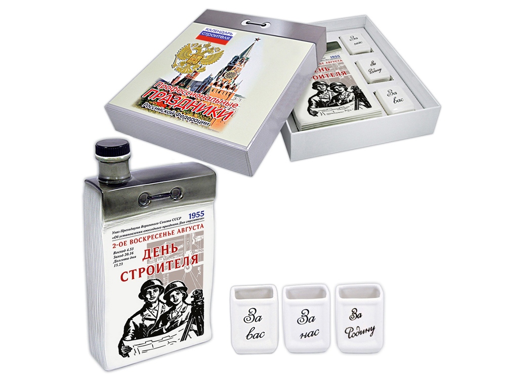 Стильный набор из штофа и рюмок стилизованный под профессиональный календарь станет креативным подарком к профессиональному празднику. Штоф и рюмки изготовлены из высококачественного фарфора. На каждой рюмке написано оригинальное послание-тост. Упакован подарок в коробку стилизованную под календарь. Идеальный и оригинальный подарок, чтобы поздравить сотрудника или руководителя с профессиональным праздником.