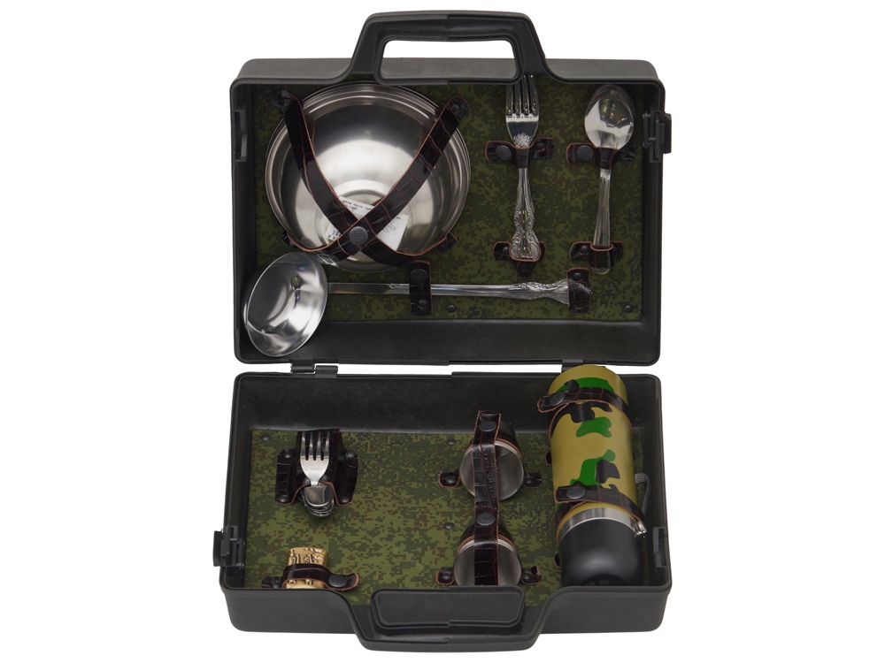 шампура большие- 6 шт, доска разделочная, вилка- 6 шт, нож, стопка- 6 шт, тарелка- 6 шт, фляга, шампура мленькие- 6 шт, мангал