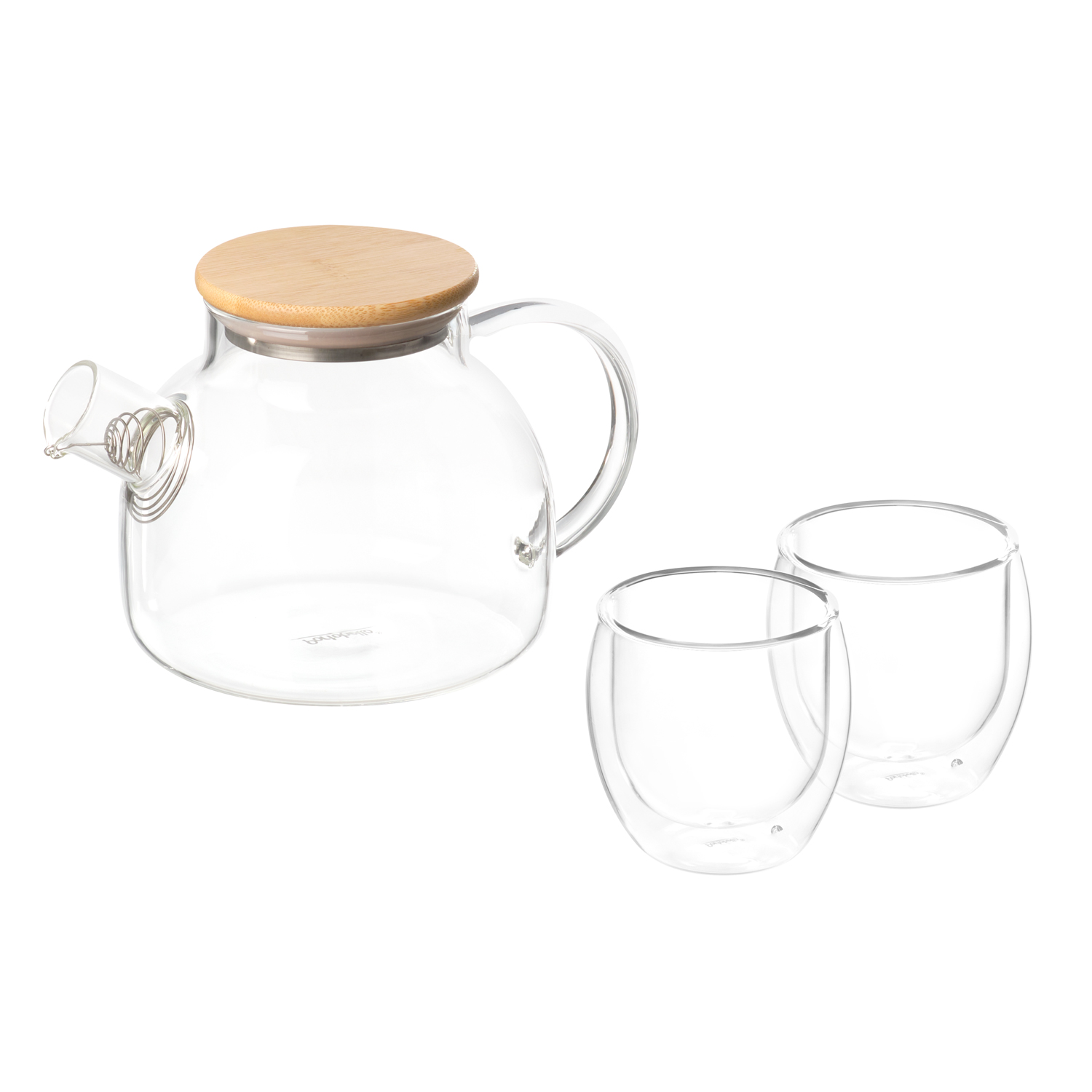 Чайник заварочный с бамбуковой крышкой объемом 800 мл подходит как для заваривания чая, так и для лимонадов или домашних морсов. Чашечки из стекла с двойными стенками будут гармонично дополнять вашу чайную церемонию.