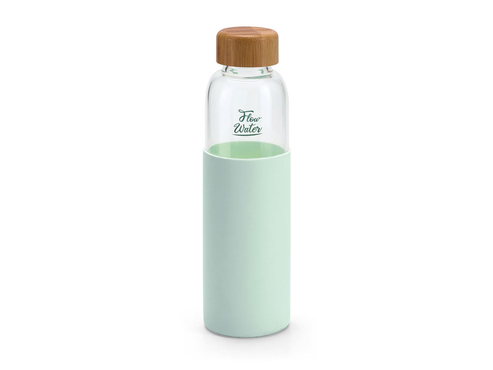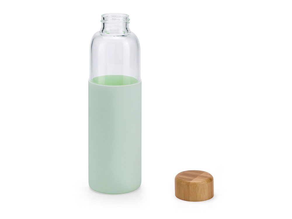 Бутылка из боросиликатного стекла с крышкой из бамбука, покрытая силиконовым рукавом. Емкость бутылки 600 мл и она поставляется в картонной коробке. Вид нанесения, рекомендуемый поставщиком: тампопечать, гравировка, трафаретная печать