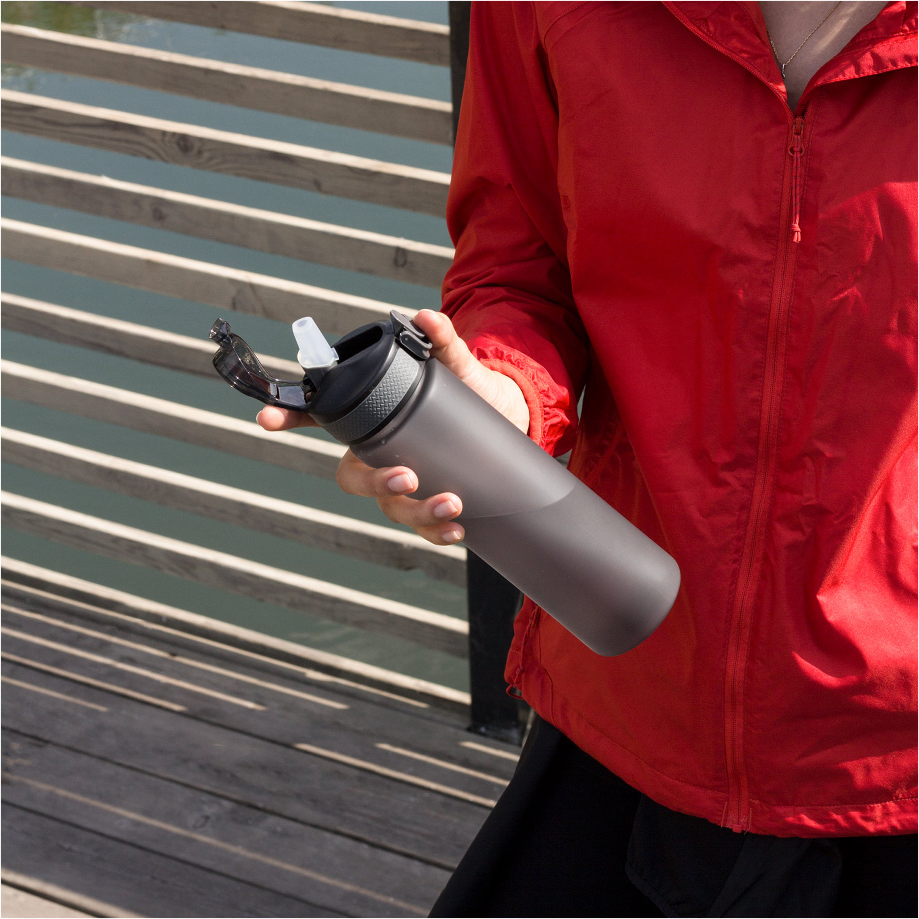 Конструкция крышки позволяет открыть бутылку, не касаясь питьевого горлышка, что гарантирует гигиеничность в использовании. Благодаря полупрозрачному корпусу вам всегда понятно, сколько жидкости осталось в бутылке.—