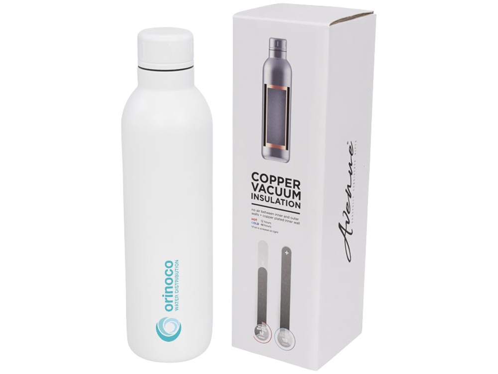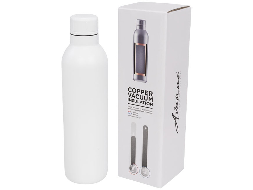 Спортивная бутылка Thor с вакуумной изоляцией объемом 510 мл. Прочная бутылка с двойными стенками из нержавеющей стали и вакуумной медной изоляцией сохраняет напитки холодными в течение 48 часов и горячими в течение не менее 12 часов. Конструкция бутылки предотвращает образование конденсата на внешней стороне. Модное, прочное порошковое покрытие. Герметичная завинчивающаяся крышка из нержавеющей стали. Объем – 510 мл. Предлагается в подарочной коробке Avenue. Нержавеющая сталь.