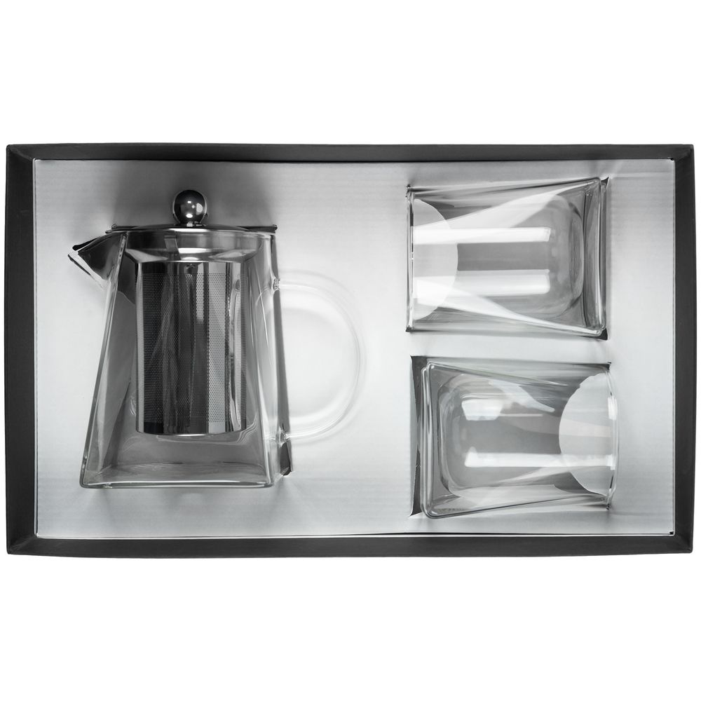 боросиликатное стекло, коробка - переплетный картон, крышка и сито - нержавеющая сталь, нержавеющая сталь, переплетный картон, чайник, стаканы - боросиликатное стекло