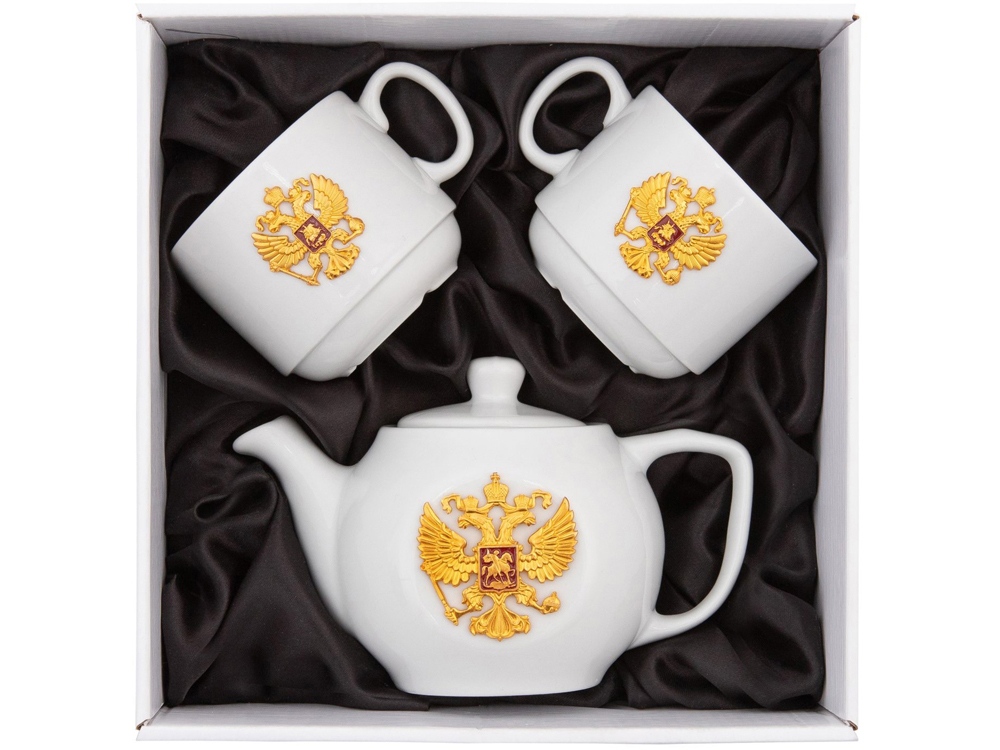 Фарфоровый чайник и две фарфоровые чайные кружки с чеканным металлическим декором Двуглавый орел. Накладка изготовлена из алюминия методом чеканки с декоративной отделкой под золото.