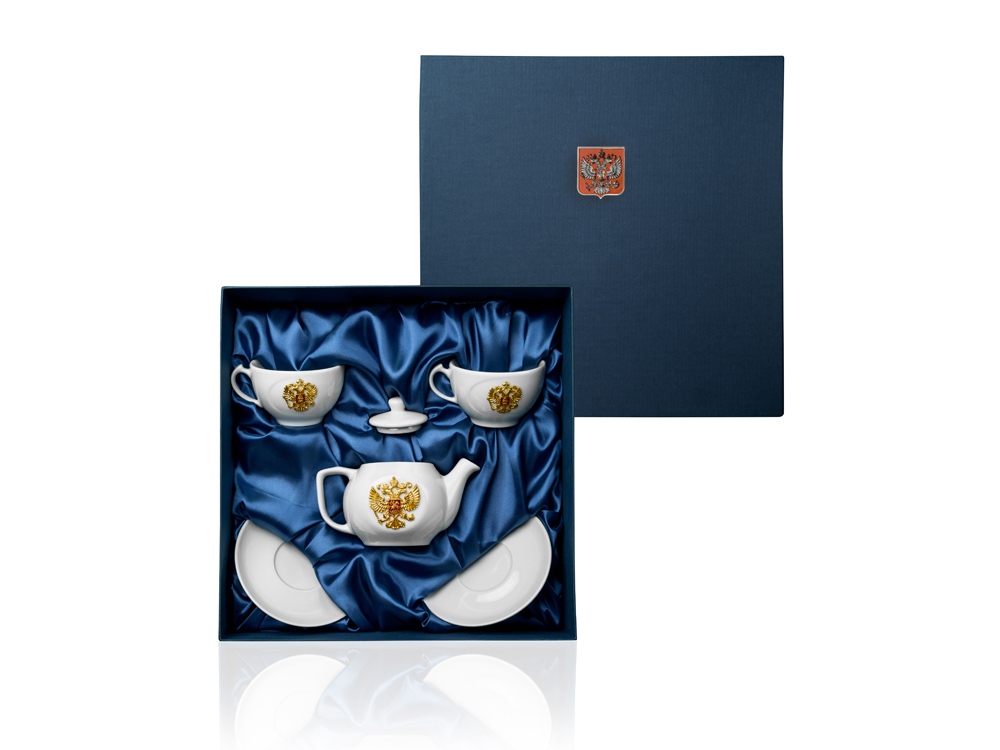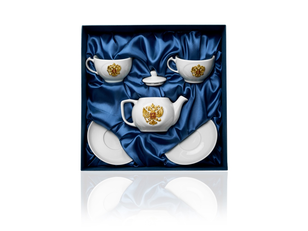 Фарфоровый чайник и две фарфоровые чайные кружки с чеканным металлическим декором Двуглавый орел. Накладка изготовлена из алюминия методом чеканки с декоративной отделкой под золото.