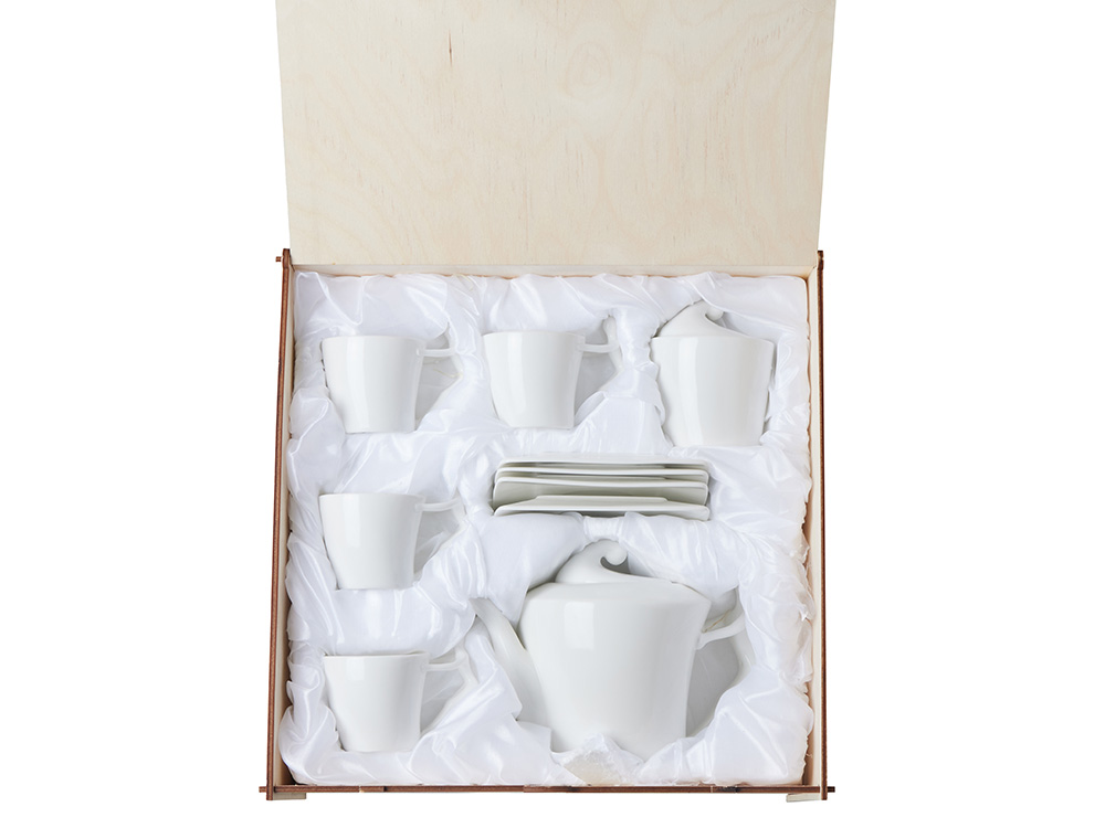 Сервиз поставляется в деревянной коробке. Вы можете нанести на нее логтип или памятную надпись. Это готовая идея для безупречного корпоративного подарка.