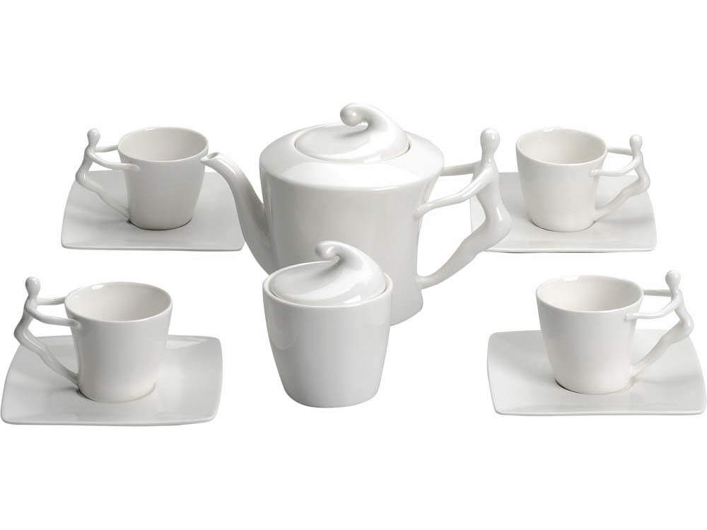 Ручки чашек и чайника выполнены в виде стилизованной фигуры человека. Это придает сервизу особый характер и глубину, превращая процесс чаепития в диалог с искусством.